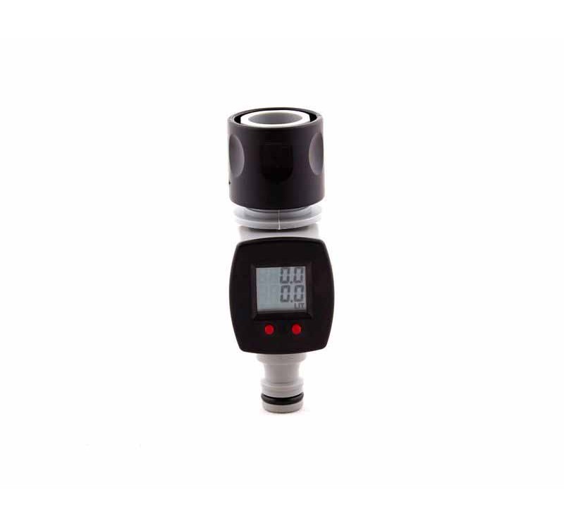 Contador de agua en línea para conectar directamente al grifo o a la lanzadera de riego. Medición en litros y galones. Controla los litros parciales y totales mostrando simultáneamente los dos valor es en la gran pantalla LCD. De este modo sabemos la cantidad de agua que damos a cada planta y los litros totales consumidos.