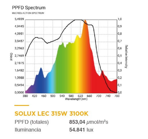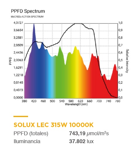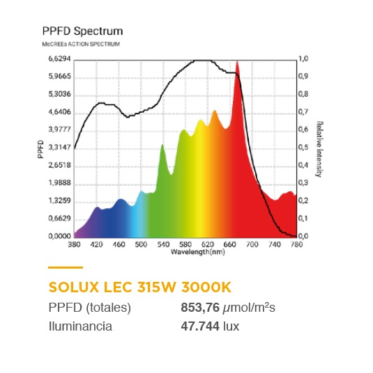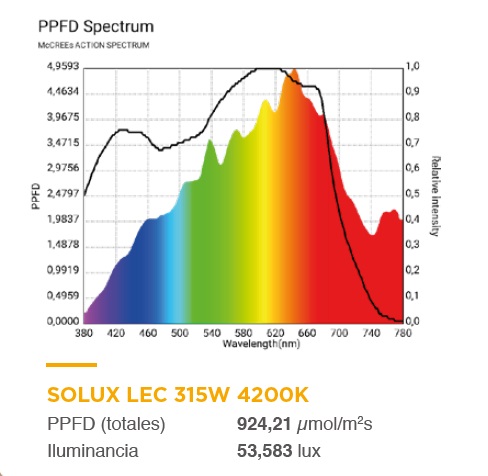 Bombilla Solux LEC 315 W en 4200 K que sirve para crecimiento y floración y se aconseja a todos aquellos cultivadores acostumbrados a cultivar con una sola lámpara de principio a fin del cultivo. Salvando las distancias, seria parecida a una Sylvania Grolux o una Philips Green Power. Es una lámpara diseñada por biólogos que consigue una luz blanca orientada al crecimiento y floración con alto CRI y PPF excepcional. Es la fuente de luz artificial más parecida al sol que existe en iluminación. Además su excepcional ratio de UV-A y UV-B proporciona a las plantas una reacción fotoquímica superior que mejora el contenido en resina.