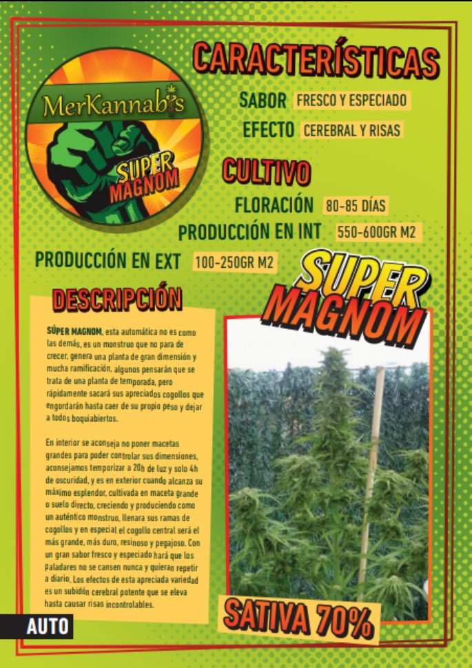 Súper MAGNOM, esta automática no es como las demás, es un monstruo que no para de crecer, genera una planta de gran dimensión y mucha ramificación, algunos pensaran que se trata de una planta de temporada, pero rápido sacara sus apreciados cogollos que engordaran hasta caer de su propio peso y dejar a todos boquiabiertos.